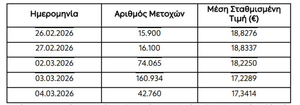 Η Δημόσια Επιχείρηση Ηλεκτρισμού Α.Ε. («ΔΕΗ»), ανακοινώνει ότι, στο πλαίσιο του προγράμματος επαναγοράς μέχρι και 36.927.000 μετοχών εκδόσεώς της (οι «Ίδιες Μετοχές»), κατά το χρονικό διάστημα από 26.02.2026 μέχρι και 04.03.2026, αγόρασε μέσω συναλλαγών στο Χρηματιστήριο Αθηνών συνολικά 309.759 Ίδιες Μετοχές, ως εξής: