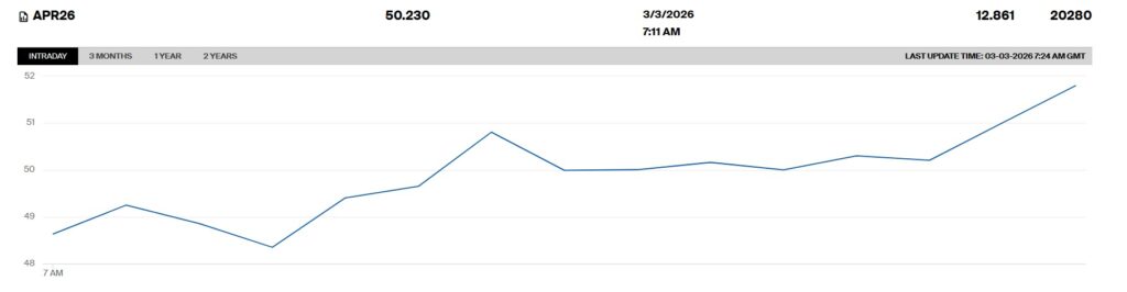 Αρχικά οι τιμές του φυσικού αερίου στην ολλανδική πλατφόρμα τη Δευτέρα ενισχύθηκαν 20%, φθάνοντας μέχρι τα 39,15 ευρώ ανά μεγαβατώρα αλλά στη συνέχεια η ανακοίνωση της Qatar Energy ότι αναστέλλει την παραγωγή LNG οδήγησαν σε νέα άνοδο μετα συμβόλαια να φθάνουν τα 48 ευρώ/MWh. Σήμερα Τρίτη 3 Μαρτίου αυή η άνοδος συνεχίζεται με την τιμή να ξεπερνά τα 50 ευρώ ανά μεγαβατώρα και με ανοδική τάση. Δηλαδή μέσα σε δύο ημέρες η άνοδος της τιμής ξεπέρασε κυμαίνεται μεταξύ 70 και 80%!