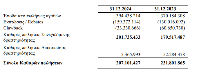 Σύμφωνα με τις δημοσιευμένες χρηματοοικονομικές καταστάσεις, τα συνολικά έσοδα ανήλθαν σε 394,438 εκατ. ευρώ αυξημένα 6,5% ένανι 370,184 εκατ. ευρώ το 2023. Αν από το ποσό αφαιρεθούν οι εκπτώσεις – rebates (159,372 εκατ. ευρώ) και clawback (33,33 εκατ. ευρώ) τα έσοδα διαμορφώνονται σε 201,735 εκατ. ευρώ αυξημένα 12,37% έναντι 179,517 εκατ. ευρώ