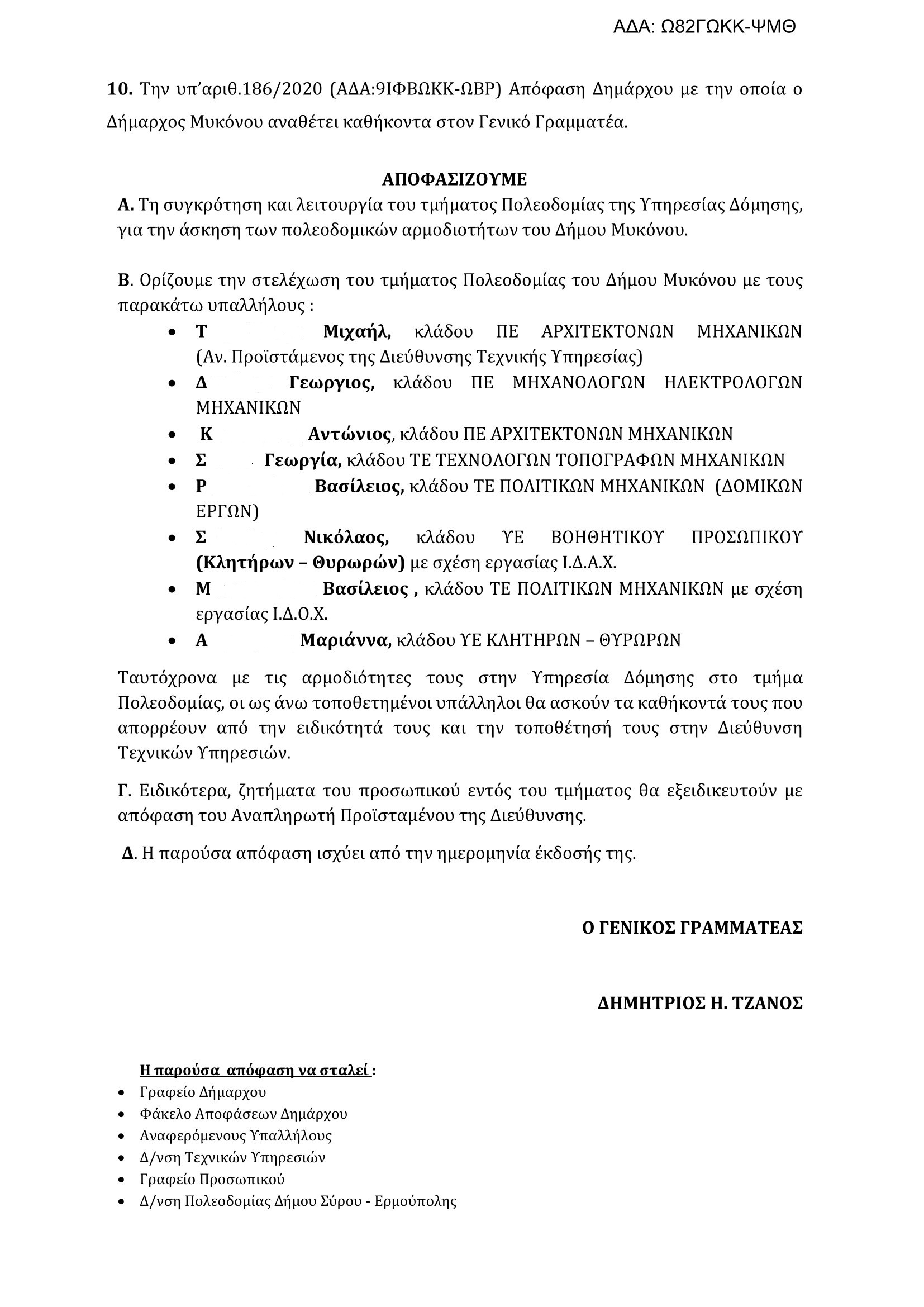 Σύμφωνα με απόφαση του δημάρχου Μυκόνου, Κώστα Κουκά, η οποία αναρτήθηκε στο ΔΙΑΥΓΕΙΑ στις 26/6/2023 και φέρνει σήμερα στο φως το mononews.gr, ολοκληρώθηκαν οι διαδικασίες για τη συγκρότηση και λειτουργία υπηρεσίας δόμησης και πολεοδομικών εφαρμογών δήμου Μυκόνου.
