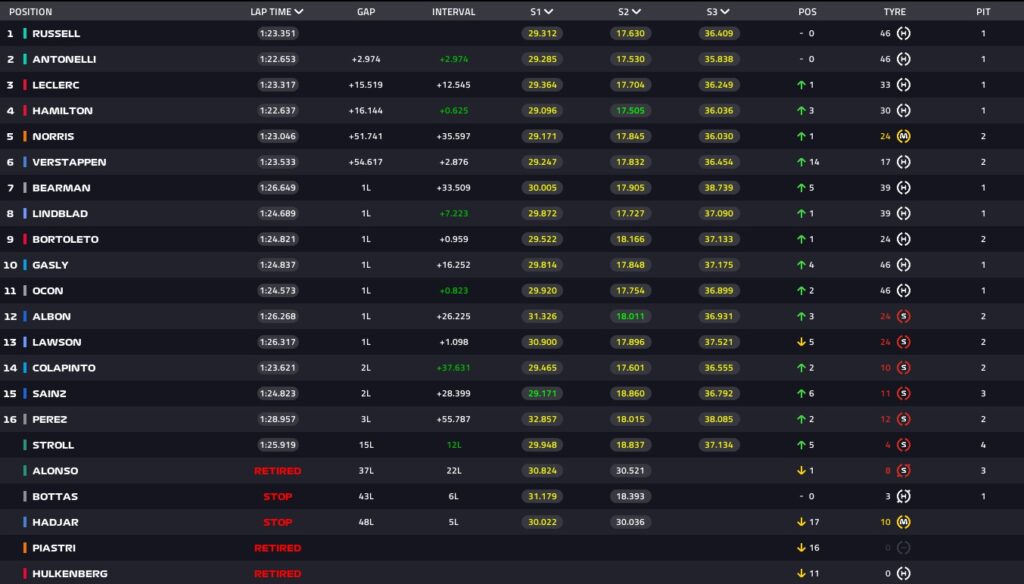 Ο Τζορτζ Ράσελ κυριάρχησε και πήρε τη νίκη, με τον Κίμι Αντονέλι να ακολουθεί σε απόσταση περίπου τριών δευτερολέπτων, παρότι στην αρχή του αγώνα υποχώρησε στην έβδομη θέση. Το πόντιουμ συμπλήρωσε ο Σαρλ Λεκλέρ με Ferrari, ενώ πίσω του, αλλά εκτός βάθρου ήταν ο ομόσταβλος Λιούις Χάμιλτον. Πέμπτος ήταν ο Λάντο Νόρις με McLaren, ενώ ο Όσκαρ Πιάστρι δεν μπόρεσε να μπει στον αγώνα μπροστά στο… κοινό του μετά από ατύχημα που είχε καθ’ οδόν για το grid.