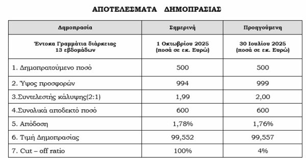 Όπως προσθέτει ο ΟΔΔΗΧ στη σχετική ανακοίνωση, η δημοπρασία πραγματοποιήθηκε μέσω των Βασικών Διαπραγματευτών Αγοράς (Primary Dealers), και η ημερομηνία διακανονισμού είναι η Παρασκευή 3 Οκτωβρίου 2025.