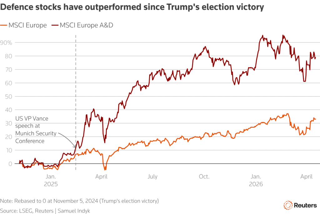Η άνοδος τροφοδοτήθηκε από δεσμεύσεις των ευρωπαϊκών κυβερνήσεων για αύξηση των αμυντικών δαπανών και από τη χαλάρωση των δημοσιονομικών κανόνων από τη Γερμανία πέρυσι, με σκοπό την επιτάχυνση της προσπάθειας επανεξοπλισμού της.