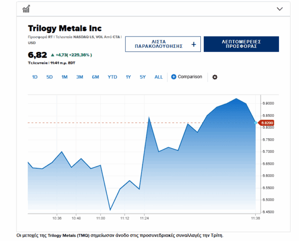 Μετοχές της εισηγμένης στο χρηματιστήριο των ΗΠΑ εξορυκτικής εταιρείας Trilogy Metals σημείωσε άνοδο άνω του 225% την Τρίτη, λίγο αφότου ο Λευκός Οίκος ανακοίνωσε ότι θα αποκτήσει μερίδιο 10% στην καναδική εταιρεία, όπως μεταδίδει το CNBC.