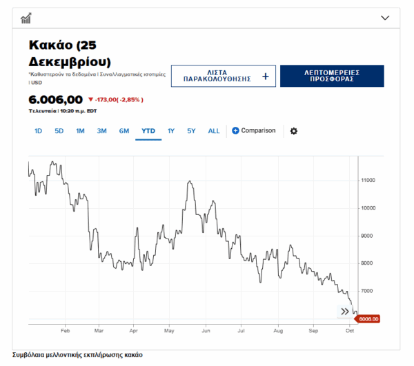 Συμβόλαια μελλοντικής εκπλήρωσης κακάο στις ΗΠΑ: Η τιμή παράδοσης Δεκεμβρίου κινήθηκε 1,4% χαμηλότερα την Τετάρτη, διαπραγματευόμενη περίπου στα 6.090 δολάρια ανά τόνο, διευρύνοντας τις απώλειες που οδήγησαν τα συμβόλαια να χάσουν το 10% της αξίας τους την εβδομάδα που έληξε στις 3 Οκτωβρίου.