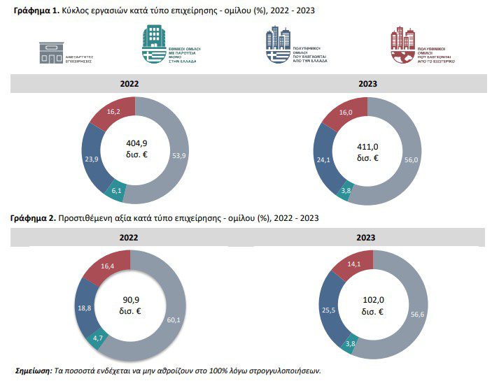 Το 2023, τη μεγαλύτερη συμβολή στον κύκλο εργασιών είχαν οι ανεξάρτητες επιχειρήσεις με 56% ή 230,3 δισ. ευρώ. Ακολουθούν οι επιχειρήσεις που ανήκουν σε πολυεθνικούς ομίλους που ελέγχονται από την Ελλάδα με 24,1% ή 99,2 δισ. ευρώ ενώ οι πολυεθνικοί όμιλοι με έλεγχο από το εξωτερικό συγκεντρώνουν 16% (65,9 δισ.) και οι εθνικοί όμιλοι 3,8% (15,6 δισ.). Η κατάταξη είναι παρόμοια και το 2022.