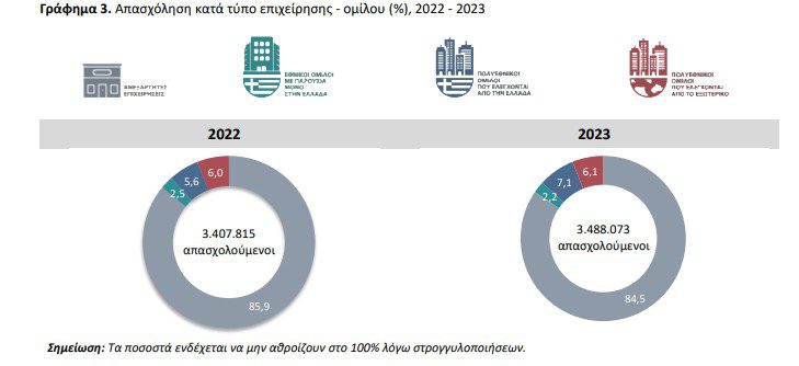 Στην αγορά εργασίας, η εικόνα είναι ακόμα πιο συγκεντρωμένη στις ανεξάρτητες επιχειρήσεις. Το 2023 απασχολούν το 84,5% των εργαζομένων (2.948.914 άτομα). Οι πολυεθνικές με ελληνικό έλεγχο απασχολούν 7,1% (249.242), οι πολυεθνικές με έλεγχο από το εξωτερικό 6,1% (211.881) και οι εθνικοί όμιλοι 2,2% (78.036).
