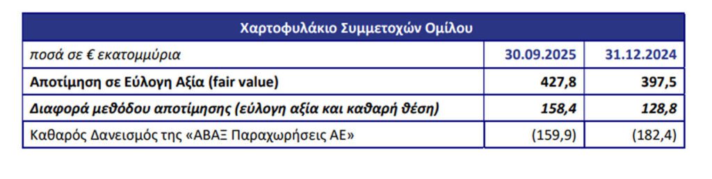 Ο καθαρός δανεισμός της 100% θυγατρικής ΑΒΑΞ Παραχωρήσεις ΑΕ, η οποία αποτελεί το όχημα του Ομίλου για τις βασικές συμμετοχές σε παραχωρήσεις, ανήλθε σε €159,9 εκατομμύρια, σημαντικά μειωμένος έναντι του τέλους 2024 λόγω των αποπληρωμών που υπερτερούν των πραγματοποιούμενων επενδύσεων σε συμμετοχές.