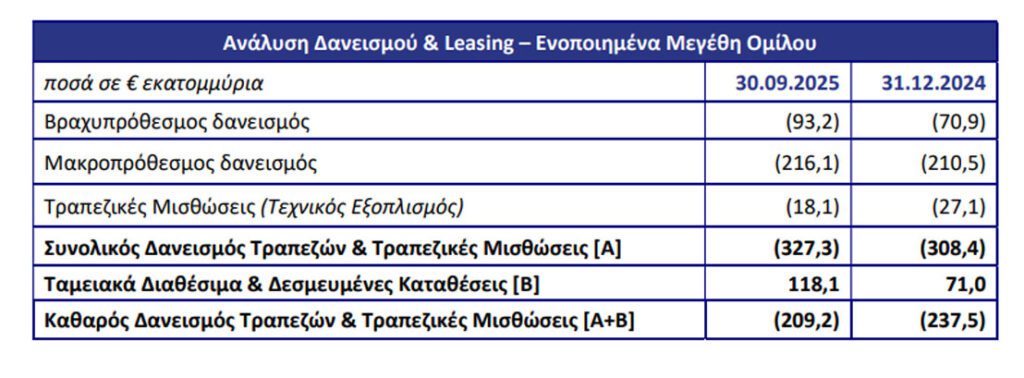 Ο καθαρός τραπεζικός δανεισμός του Ομίλου (συμπεριλαμβανομένων των υποχρεώσεων από leasing εξοπλισμού) μειώθηκε σημαντικά στη διάρκεια του εννεαμήνου του τρέχοντος έτους, ανερχόμενος σε €209,2 εκατομμύρια την 30.09.2025 από €237,5 εκατομμύρια την 31.12.2024. Ο δείκτης μόχλευσης (Καθαρός Δανεισμός / EBITDA) μειώθηκε περαιτέρω, φτάνοντας το 1,60x με βάση το EBITDA των τελευταίων 12 μηνών. Η βελτίωση του δείκτη οφείλεται στη συνεχιζόμενη ενίσχυση του EBITDA και τον περιορισμό του καθαρού δανεισμού, παρά την αύξηση του κύκλου εργασιών.