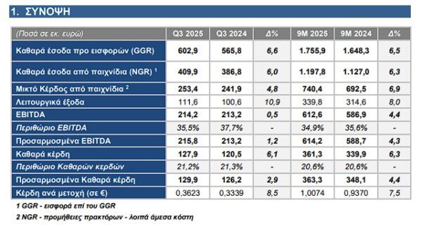 Τα καθαρά έσοδα προ εισφορών (GGR) 9μήνου 2025 διαμορφώθηκαν στα €1.755,9εκ. έναντι €1.648,3εκ. το εννεάμηνο 2024, αυξημένα κατά 6,5% σε ετήσια βάση. Συνολικά, η αύξηση της κερδοφορίας συνδυάστηκε με υγιή περιθώρια κέρδους και ισχυρή ταμειακή θέση, όπως αναφέρει η ανακοίνωση.