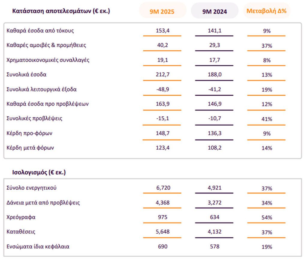 Τα καθαρά έσοδα από τόκους αυξήθηκαν κατά 9% σε ετήσια βάση στα €153,4 εκατ. λόγω 34% υψηλότερων δανειακών υπολοίπων και ανθεκτικών δανειακών περιθωρίων