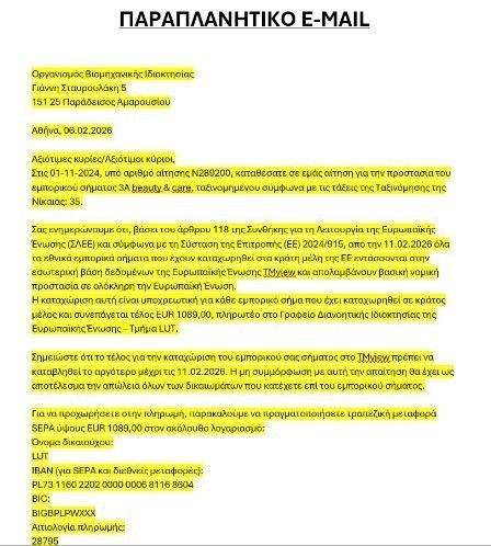 Ο Οργανισμός Βιομηχανικής Ιδιοκτησίας (ΟΒΙ) ενημερώνει το κοινό ότι κατά το τελευταίο εικοσιτετράωρο έχουν εντοπιστεί περιστατικά ηλεκτρονικής απάτης, τα οποία αφορούν στην αποστολή παραπλανητικών ηλεκτρονικών μηνυμάτων στους καταθέτες /δικαιούχους εμπορικών σημάτων, με αιτήματα καταβολής τελών που φέρονται να σχετίζονται με υπηρεσίες του Οργανισμού.