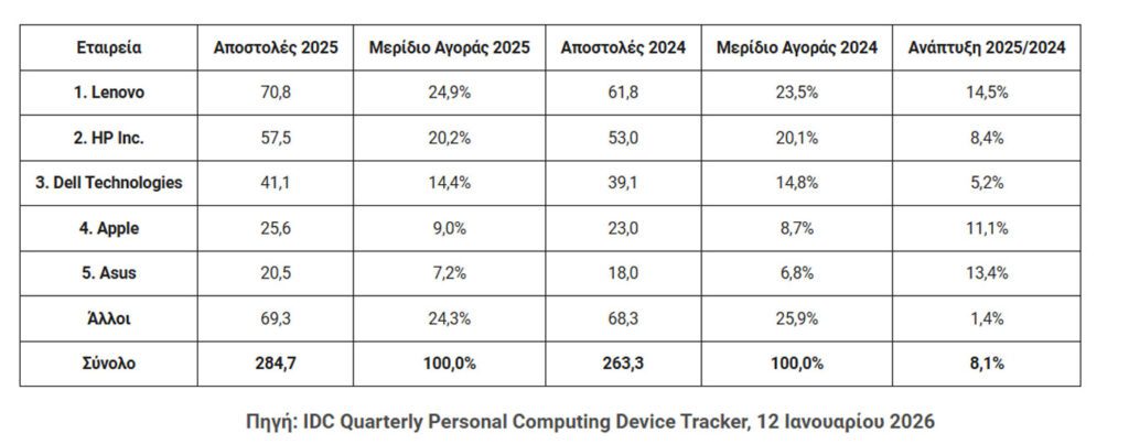 Η παγκόσμια αγορά προσωπικών υπολογιστών κατέγραψε αύξηση 9,6% στο τέταρτο τρίμηνο του 2025, σύμφωνα με στοιχεία της IDC, σε ένα περιβάλλον έντονης αγοραστικής κινητικότητας που συνδέθηκε με ανησυχίες για επικείμενες ελλείψεις βασικών εξαρτημάτων.