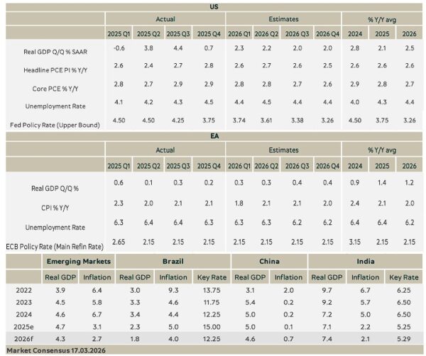 Στις ΗΠΑ, ο ρυθμός ανάπτυξης κατά το Δ΄ Τρίμηνο του 2025 διαμορφώθηκε στο 2,0% σε ετήσια βάση (Γ΄ Τρίμ.: 2,3%) και συνολικά το 2025 στο 2,1% (2024: 2,8%). Ο πληθωρισμός βάσει του PCE παραμένει υψηλός σε σχέση με τον στόχο του 2% της Fed και οι συνθήκες στην αγορά εργασίας προδιαγράφουν σχετική ισορροπία της ζήτησης και της προσφοράς με κύριο χαρακτηριστικό τον περιορισμένο αριθμό τόσο των νέων θέσεων εργασίας, όσο και των απολύσεων. Ωστόσο, οι δαπάνες του πολέμου ασκούν επιπλέον πίεση στην ομαλή εκτέλεση του προϋπολογισμού, ενώ περιορίζονται και τα προβλεπόμενα δασμολογικά έσοδα μετά την μετά την απόφαση του Ανώτατου Δικαστηρίου που έκρινε ως αντισυνταγματικούς τους «ανταποδοτικούς» δασμούς και την προσωρινή αντικατάστασή τους από άλλους χαμηλότερους. Από την άλλη, όμως, οι ΗΠΑ βρίσκονται στην καλύτερη θέση μεταξύ των μεγάλων οικονομιών για τη διαχείριση των ενεργειακών προκλήσεων λόγω της μεγάλης εγχώριας παραγωγής πετρελαίου και φυσικού αερίου.