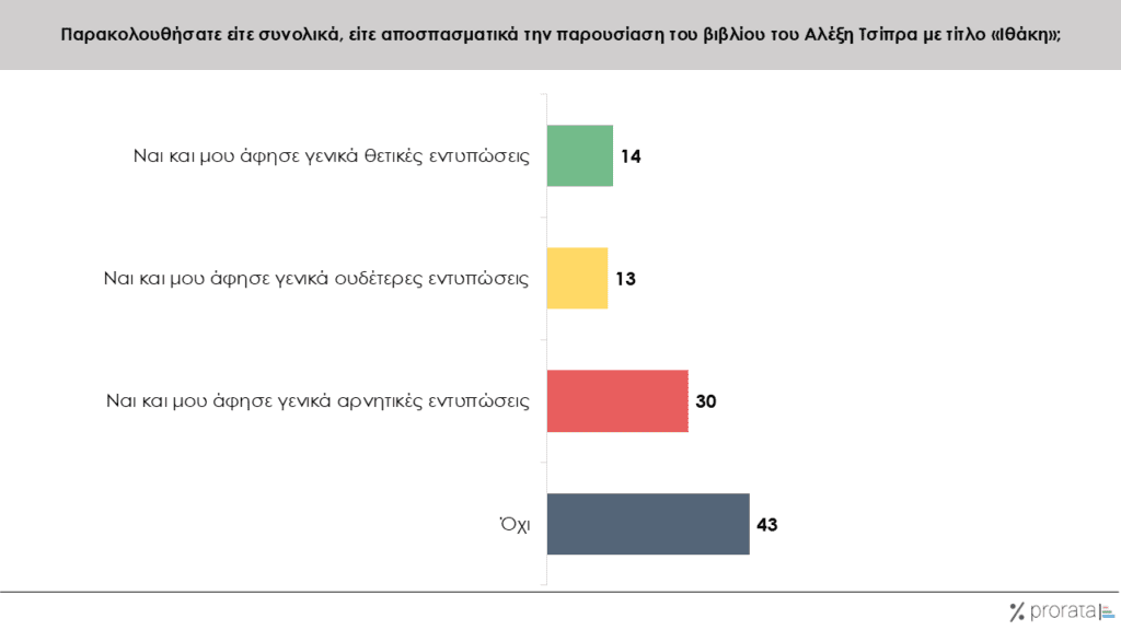 Λίγο πάνω από τους μισούς ψηφοφόρους (το 57% της κοινής γνώμης) παρακολούθησε είτε συνολικά, είτε αποσπασματικά την παρουσίαση του βιβλίου του Αλέξη Τσίπρα, με τίτλο «Ιθάκη», σύμφωνα με τα αποτελέσματα της πανελλαδικής πολιτικής έρευνας που διενήργησε η εταιρεία ερευνών και δημοσκοπήσεων Prorata κατά το διάστημα 5 έως 8 Δεκεμβρίου 2025.