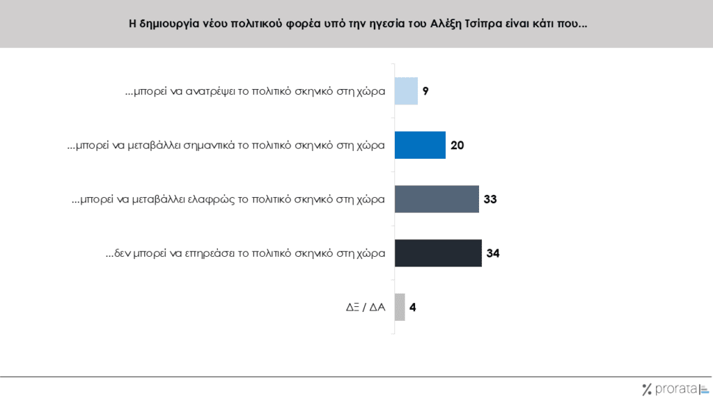 Ως προς την πρώτη διάσταση, το 77% εκτιμάει πως ο πρώην πρωθυπουργός δεν θα μπορούσε να ανατρέψει – ή έστω να μεταβάλλει σημαντικά – τα πολιτικά πράγματα και το 29% ότι θα μπορούσε, είτε να ανατρέψει συνολικά το πολιτικό σκηνικό, είτε έστω να το μεταβάλλει σημαντικά. Ως προς την δεύτερη διάσταση, δηλαδή τα όρια της δυνητικής εκλογικής επιρροής ενός φορέα υπό την ηγεσία του Αλέξη Τσίπρα, το 9% δηλώνει πως είναι βέβαιο ότι θα τον ψήφιζε, το 13% ότι είναι σχετικά πιθανό να τον ψήφιζε, ενώ το 75% ότι είτε αποκλείεται, είτε ότι είναι σχετικά απίθανο να το πράξει.