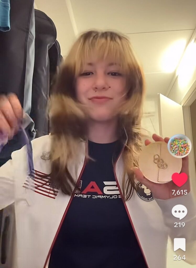 H Αμερικανίδα χρυσή ολυμπιονίκης Αλίσα Λιού με το μετάλλιο και την κορδέλα που αποκολλήθηκε.