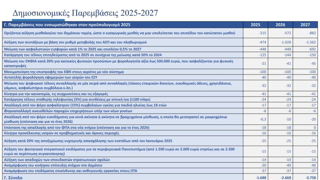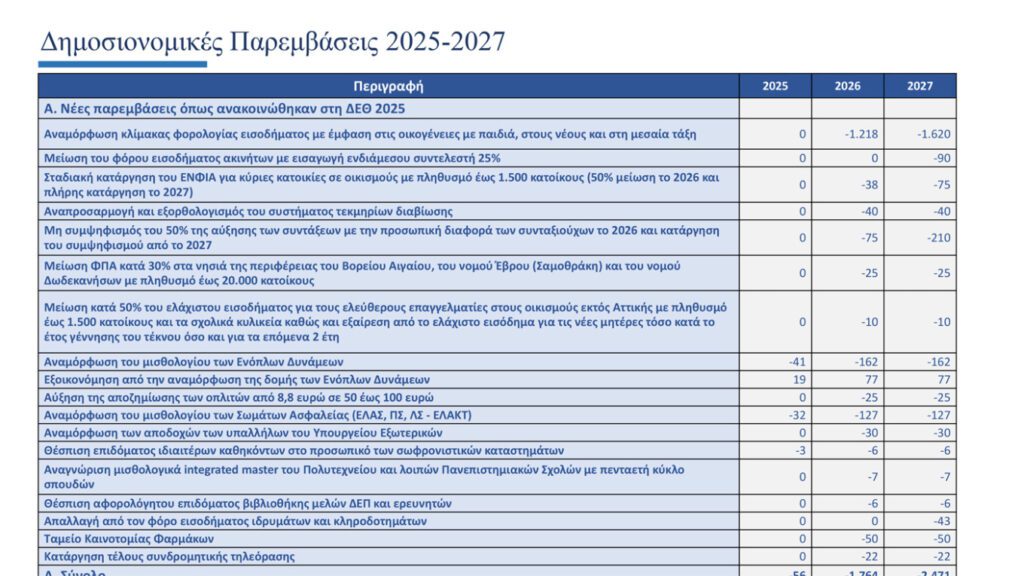 Πρόκειται για ένα πακέτο μέτρων το οποίο αγγίζει μισθούς, συντάξεις, φόρους, τεκμήρια, ΕΝΦΙΑ, ΦΠΑ στα νησιά, μισθολόγια ειδικών κατηγοριών, ελαφρύνσεις για ελεύθερους επαγγελματίες και στοχευμένα κίνητρα στην αγορά ακινήτων.