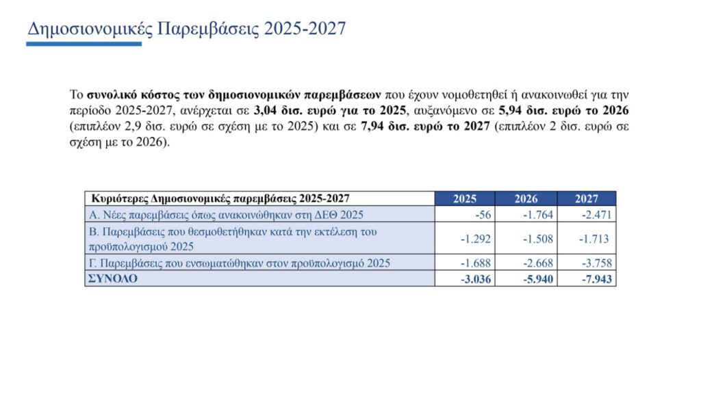 Στα 5,94 δισ. ευρώ διαμορφώνεται το συνολικό πακέτο των δημοσιονομικών παρεμβάσεων που ενσωματώνει ο προϋπολογισμός του 2026, αυξημένο κατά 2,9 δισ. ευρώ σε σχέση με το 2025 και με τα 1,76 δισ. ευρώ εξ’ αυτών να αποτελούν το νέο πακέτο μέτρων που ανακοινώθηκε στη ΔΕΘ.