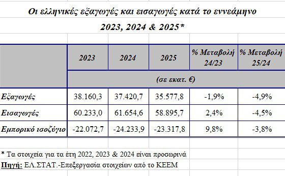 Οι εισαγωγές στο ίδιο διάστημα, μειώθηκαν κατά 4,5%, με τη συνολική τους αξία να διαμορφώνεται στα 58,90 δισ. ευρώ. Ως αποτέλεσμα των παραπάνω κινήσεων, το εμπορικό έλλειμμα συρρικνώθηκε κατά 3,8% και άγγιξε στο εννεάμηνο του 2025 τα 23,32 δισ. ευρώ.