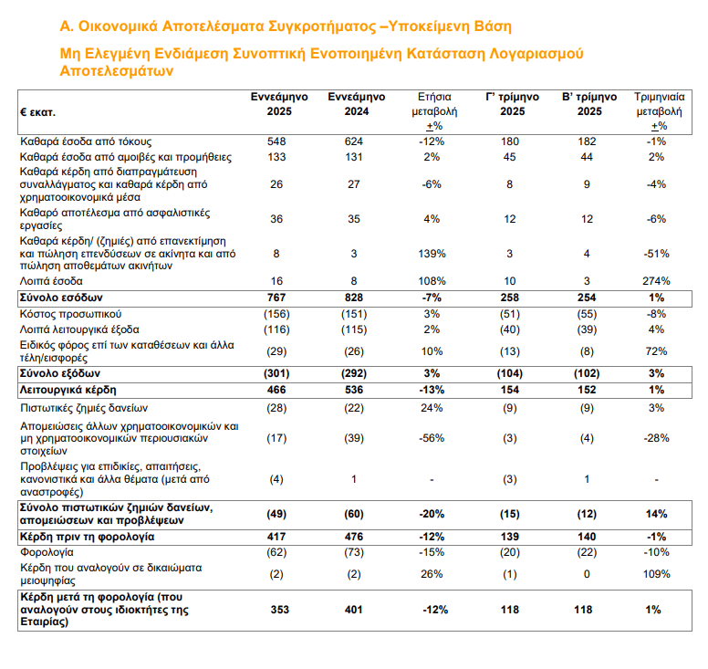 Η αποτελεσματικότητα κόστους παραμένει ισχυρή, με αναπροσαρμοσμένο δείκτη κόστος/έσοδα στο 35% (39% στη δημοσιευμένη μέτρηση), ενώ τα καθαρά έσοδα από τόκους του 9μήνου διαμορφώθηκαν στα €548 εκατ. (-12% ετησίως) και τα συνολικά έσοδα στα €767 εκατ. (-7%).