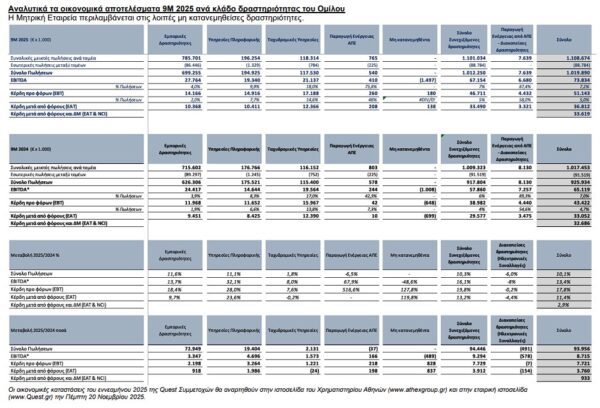 Ο Όμιλος Quest κατά το 9μηνο του 2025 κατέγραψε ενοποιημένες πωλήσεις 1,02 δισ. ευρώ, κέρδη EBITDA 73,8 εκατ. ευρώ, κέρδη προ φόρων 51,1 εκατ. ευρώ και κέρδη μετά από φόρους 36,8 εκατ. ευρώ