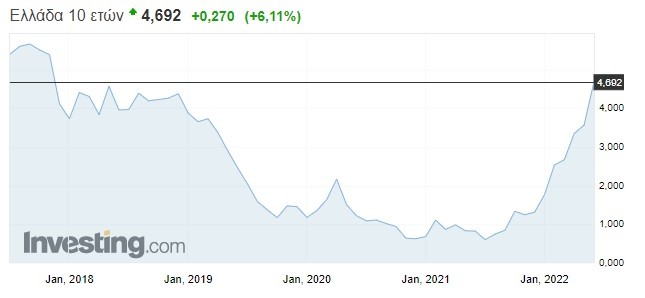Μέσα σ΄ αυτό το πλαίσιο, η ανησυχία για τον κίνδυνο ύφεσης επηρεάζει δυσμενώς τις αποδόσεις των κρατικών ομολόγων, με το ελληνικό 10ετές να φθάνει στο 4,65% και να σκαρφαλώνει στο υψηλότερο επίπεδο από τον Δεκέμβριο του 2017. Tα spreads, παράλληλα, -δηλαδή η απόκλιση με τις αποδόσεις των 10ετών ομολόγων της Γερμανίας- καθορίζονται στις 302 μονάδες βάσης (υψηλό τριών ετών).