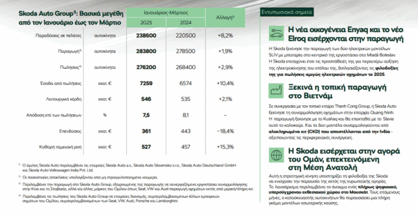 Η SKODA AUTO συνεχίζει την ανοδική της πορεία σε παγκόσμιο επίπεδο, σημειώνοντας αύξηση 8,2% στις παραδόσεις οχημάτων για το α΄ τρίμηνο του 2025. Τα έσοδα από πωλήσεις ανήλθαν στα 7,26 δισ. ευρώ (+10,4%), ενώ οι καθαρές ταμειακές ροές αυξήθηκαν κατά 15,3%, φτάνοντας τα 527 εκατ. ευρώ – επιβεβαιώνοντας τη σταθερά θετική οικονομική της πορεία.