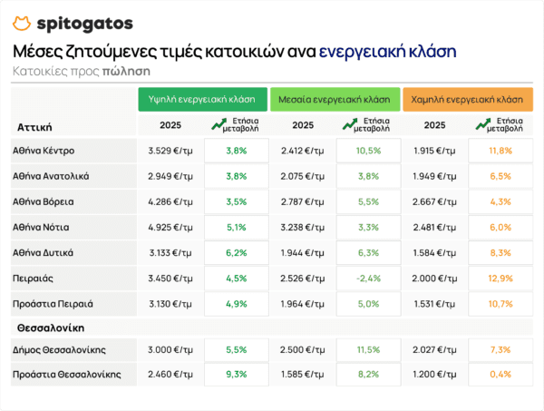 Σύμφωνα με τα στοιχεία του Spitogatos Insights για το 2025, παρατηρούνται σαφείς διαφοροποιήσεις στις ετήσιες μεταβολές μέσων ζητούμενων τιμών (ΜΖΤ) ανά ενεργειακή κλάση, με τις κατοικίες χαμηλής ενεργειακής απόδοσης να εμφανίζουν τις εντονότερες αυξήσεις σε πολλές περιοχές, ενώ τα νεόδμητα ακίνητα συνεχίζουν να διατίθενται σε σημαντικά υψηλότερες ζητούμενες τιμές λόγω της περιορισμένης προσφοράς, ιδιαίτερα στα μεγάλα αστικά κέντρα.