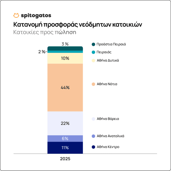 To Spitogatos Insights εξέτασε την κατανομή της προσφοράς νεόδμητων κατοικιών (stock) στους διάφορους τομείς της Αττικής το 2025. Σημαντικό ενδιαφέρον παρουσιάζει το γεγονός ότι πάνω από το 60% των διαθέσιμων νεόδμητων κατοικιών στην Αττική συγκεντρώνεται στα Νότια και στα Βόρεια Προάστια, όπου καταγράφονται και οι υψηλότερες ΜΖΤ πώλησης. Αντίθετα, χαμηλότερα ποσοστά εντοπίζονται στον Δήμο Αθηναίων και στα Δυτικά Προάστια.