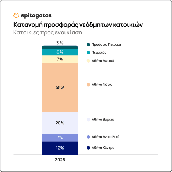 Σε ό,τι αφορά τις κατοικίες προς ενοικίαση, τα Νότια Προάστια συγκεντρώνουν το 45% του συνολικού διαθέσιμου stock νεόδμητων κατοικιών στην Αττική το 2025, ενώ ακολουθούν τα Βόρεια Προάστια με ποσοστό 20%, μειωμένο κατά 4% σε σχέση με την προηγούμενη χρονιά. Ακολουθεί ο Δήμος Αθηναίων με ποσοστό 12%, ενώ μικρότερα ποσοστά εντοπίζονται στα Ανατολικά και Δυτικά Προάστια, καθώς και στον Πειραιά και τα Προάστιά του.