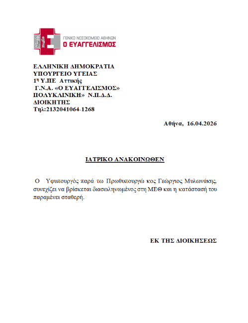 Όπως αναφέρει το τελευταίο ιατρικό ανακοινωθέν: «Ο Υφυπουργός παρά τω Πρωθυπουργώ κος Γεώργιος Μυλωνάκης, συνεχίζει να βρίσκεται διασωληνωμένος στη ΜΕΘ και η κατάστασή του παραμένει σταθερή».