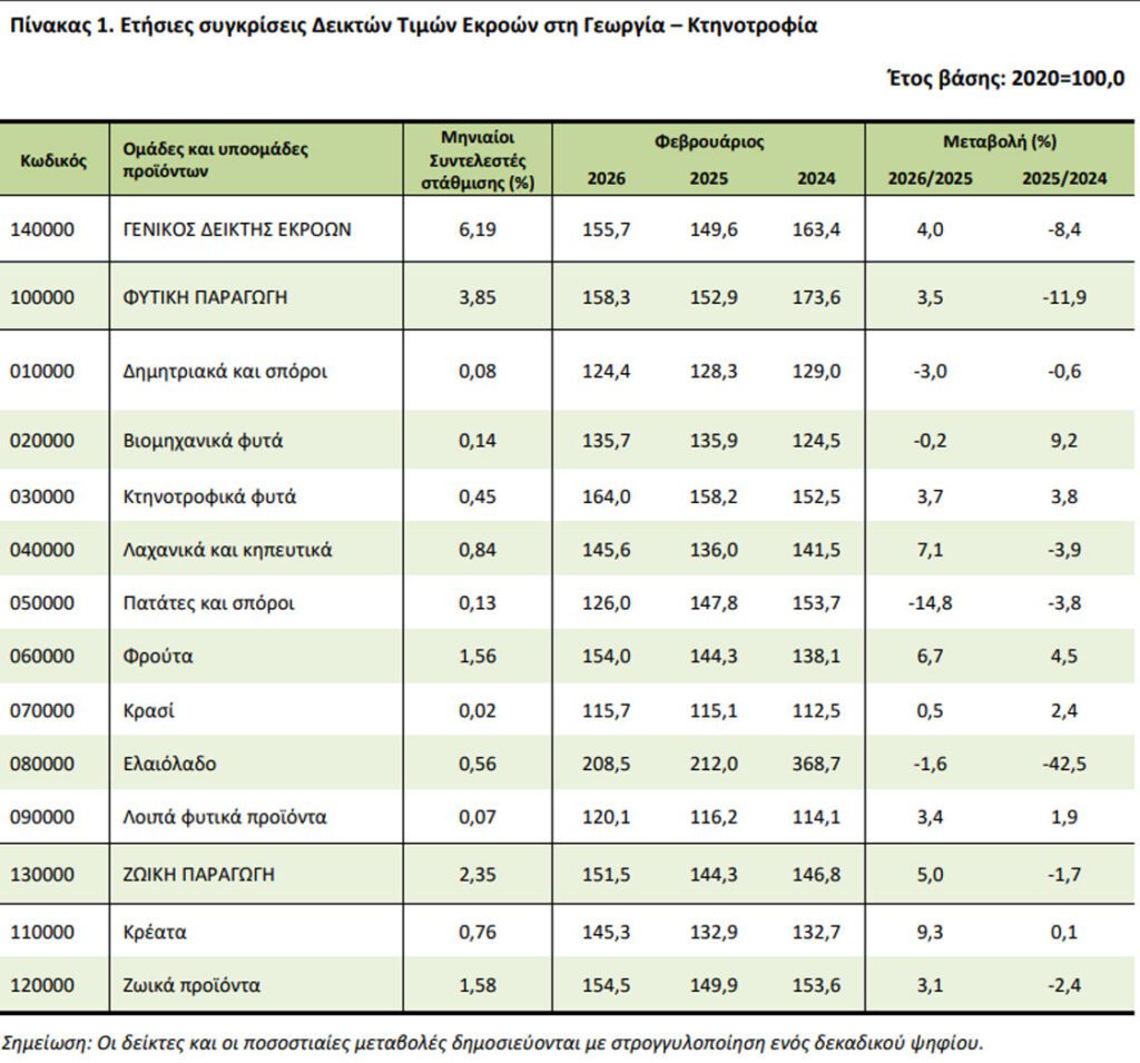 Η αύξηση του Γενικού Δείκτη Τιμών Εκροών κατά 4,0%, τον μήνα Φεβρουάριο 2026 σε σύγκριση με τον αντίστοιχο δείκτη του Φεβρουαρίου 2025, προκύπτει: α) από την αύξηση κατά 3,5% του δείκτη τιμών της φυτικής παραγωγής και κυρίως στη μεταβολή της ομάδας φρούτα, και β) από την αύξηση κατά 5,0% του δείκτη τιμών της ζωικής παραγωγής.