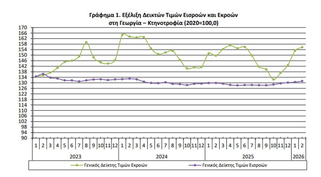 Ο Γενικός Δείκτης Τιμών Εκροών στη Γεωργία – Κτηνοτροφία (χωρίς επιδοτήσεις) του μηνός Φεβρουαρίου 2026, σε σύγκριση με τον αντίστοιχο δείκτη του Φεβρουαρίου 2025, παρουσίασε αύξηση 4,0%.