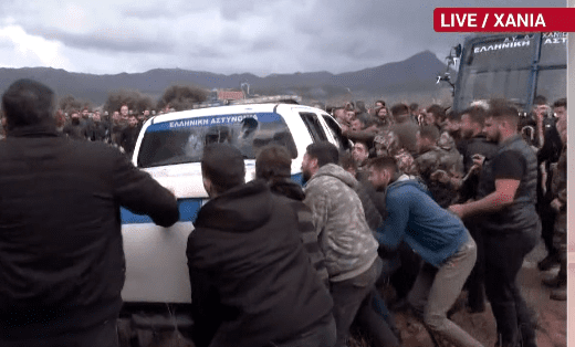 Τα επεισόδια ξεκίνησαν όταν η αστυνομία, με κλούβα και παρουσία ΜΑΤ απέκλεισαν την Ε.Ο. Αεροδρομίου Σούδας, τον δρόμο προς αεροδρόμιο μετά τον κυκλικό κόμβο Παζινού, ώστε να μείνει ανεμπόδιστη η πρόσβαση στον αερολιμένα από το Καμπάνι.