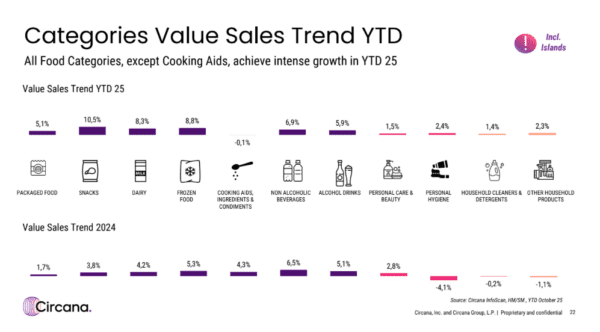 Εξάλλου, σύμφωνα με τα στοιχεία που επικαλείται η Circana, τα σνακ ήταν αυτά που σημείωσαν άλμα μέχρι και τον Οκτώβριο σε αξία, σε ποσοστό 10,5%, ενώ ακολούθησαν τα κατεψυγμένα προϊόντα με 8,8% και τα γαλακτοκομικά με 8,3%. Στις υπόλοιπες θέσεις βρίσκονται τα μη αλκοολούχα ποτά με 6,9% και τα μη αλκοολούχα ποτά, με 5,9%.