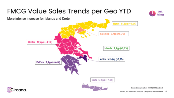Σύμφωνα με τη μελέτη της Circana για τις καταναλώσεις σε όλη την Ελλάδα τον περασμένο Οκτώβριο, τα νησιά και η Κρήτη κατείχαν σημαντικό μέρος των δαπανών σε καθημερινά προϊόντα, τρόφιμα και είδη καθαρισμού, παρότι θεωρητικά ξεκινάμε να μπαίνουμε στην χειμερινή περίοδο. Ωστόσο, ο Οκτώβριος είναι μήνας κατά τον οποίο στη χώρα μας είναι ανοικτά τα περισσότερα θερινά καταλύματα, με αποτέλεσμα να εξακολουθούν να υπάρχουν καταναλώσεις που οφείλονται στον τουρισμό. Η ανοδική πορεία και σε αυτά τα προϊόντα έχουν πλέον τα ιδιωτικής ετικέτας, καθώς πάνω από ένα στα τέσσερα αγαθά που αγοράζεται από το σούπερ μάρκετ από τον Έλληνα καταναλωτή δεν έχει τη σφραγίδα γνωστού brand.