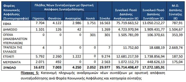 Αντίστοιχα, η συνολική δαπάνη των αναδρομικών στους νέους συνταξιούχους με τροποποιητική απόφαση συνταξιοδότησης ανέρχεται σε 15.469.510,63€ και η συνολική δαπάνη συντάξεων σε 6.064.231,89€ για την πληρωμή 6.722 τροποποιητικών συντάξεων.