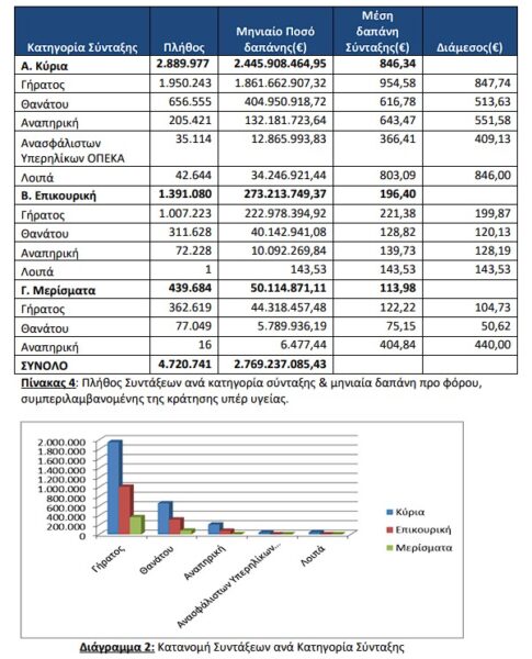 Επισημαίνεται, ότι η εν λόγω ανάλυση αφορά σε συντάξεις και όχι εισόδημα συνταξιούχου. Στην κατηγορία «γήρατος» έχει συμπεριληφθεί και το επίδομα κοινωνικής αλληλεγγύης ανασφάλιστων υπερηλίκων του ΟΠΕΚΑ. Τα ποσά σε κάθε περίπτωση περιλαμβάνουν τις κρατήσεις φόρου, τις κρατήσεις υπέρ υγείας και ΑΚΑΓΕ.