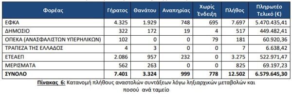 Το μήνα Νοέμβριο διακόπηκαν λόγω ληξιαρχικών μεταβολών (θάνατος, γάμος) 12.502 συντάξεις συνολικού ποσού 6.579.645,30€ από τις οποίες 3.275 ήταν επικουρικές (ΕΤΕΑΕΠ).