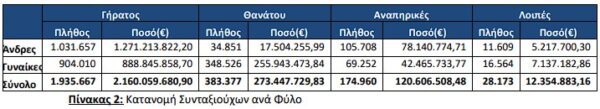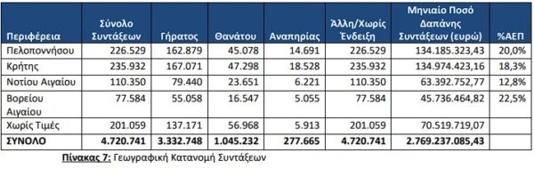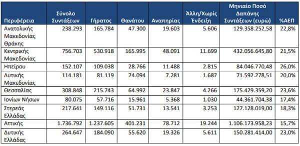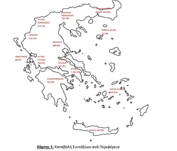 στην Αττική (1.736.792) και την Κεντρική Μακεδονία (756.703). Ακολουθεί η Θεσσαλία με 308.848 συντάξεις και η Δυτική Ελλάδα με 264.647.