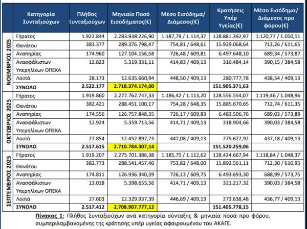 Τον Νοέμβριο του 2025 πληρώθηκαν συνολικά 4.720.741 συντάξεις, από τις οποίες οι 2.889.977 ήταν κύριες, οι 1.391.080 επικουρικές και 439.684 μερίσματα. Η μηνιαία δαπάνη που κατέβαλλαν τα ταμεία ανήλθε σε 2.769.237.085,43€ και περιλαμβάνει τις κρατήσεις φόρου, τις κρατήσεις υπέρ υγείας και ΑΚΑΓΕ.