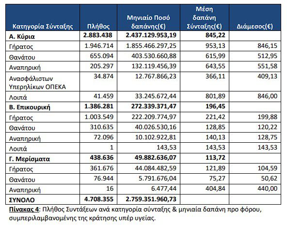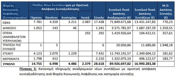 Τον Σεπτέμβριο του 2025 πληρώθηκαν συνολικά 4.708.355 συντάξεις, από τις οποίες οι 2.883.438 ήταν κύριες, οι 1.386.281 επικουρικές και 438.636 μερίσματα. Η μηνιαία δαπάνη που κατέβαλλαν τα ταμεία ανήλθε σε 2.759.351.960,73€ και περιλαμβάνει τις κρατήσεις φόρου, τις κρατήσεις υπέρ υγείας και ΑΚΑΓΕ.