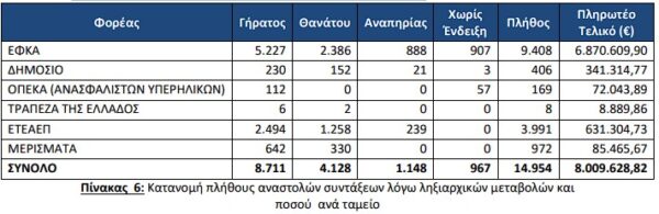 Το μήνα Σεπτέμβριο διακόπηκαν 14.954 συντάξεις συνολικού ποσού 8.009.628,82€ από τις οποίες 3.991 ήταν επικουρικές (ΕΤΕΑΕΠ).
