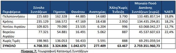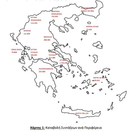 Όπως προκύπτει από την επεξεργασία του πεδίου του ταχυδρομικού κώδικα των δικαιούχων στα αρχεία των συντάξεων, ο μεγαλύτερος αριθμός συντάξεων καταβάλλεται στην Αττική (1.733.226) και την Κεντρική Μακεδονία (755.033). Ακολουθεί η Θεσσαλία με 308.285 συντάξεις και η Δυτική Ελλάδα με 263.891. Στην Περιφέρεια Ηπείρου παρατηρείται η μεγαλύτερη τιμή