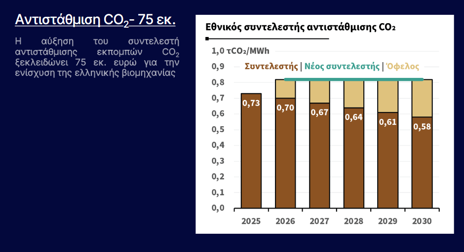 Για 40 με 50 μεγάλες ενεργοβόρες βιομηχανίες κλείδωσε νέος συντελεστής για αντιστάθμιση των εκπομπών CO2. Ο νέος συντελεστής από το 2026 έως το 2030 θα είναι στο 0,82 αντί για 0,58 τόνους ανά μεγαβατώρα. Το κόστος του μέτρου είναι περίπου 75 εκατ. ευρώ κάθε χρόνο.