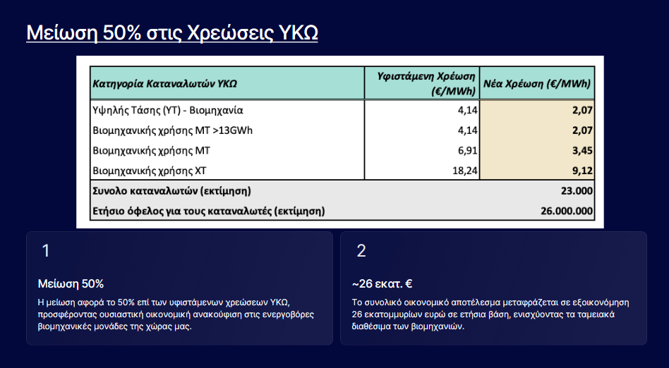 Από την 1η Ιουλίου επίσης μειώνονται κατά 50% οι χρεώσεις για τις Υπηρεσίες Κοινής Ωφέλειας (ΥΚΩ) που πληρώνουν 23.000 βιομηχανίες, οι οποίες ηλεκτροδοτούνται από τη μέση και υψηλή τάση. Το κόστος των μέτρων είναι στα 26 εκατ. ευρώ.