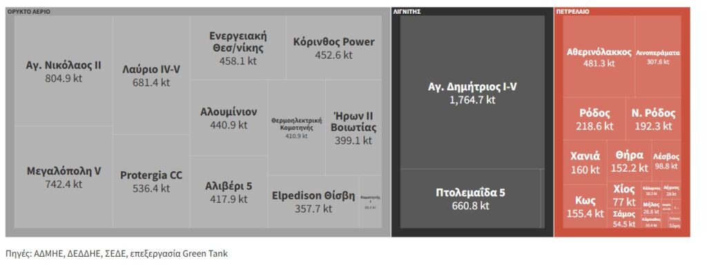 Στις Μη Διασυνδεδεμένες Νήσους, οι πέντε μεγαλύτεροι ρυπαντές είναι οι τρεις πετρελαϊκοί σταθμοί της Κρήτης και οι δύο της Ρόδου: Αθερινόλακκος (0,48 Mt, 23,5% των εκπομπών των πετρελαϊκών μονάδων), Λινοπεράματα (0,31 Mt), Χανιά (0,16 Mt), Ρόδος (0,22 Mt) και Ν. Ρόδος (0,19 Mt). Η εικόνα αυτή υπογραμμίζει πόσο κρίσιμες είναι οι διασυνδέσεις και η αποθήκευση για τη δραστική μείωση εκπομπών στα νησιά.
