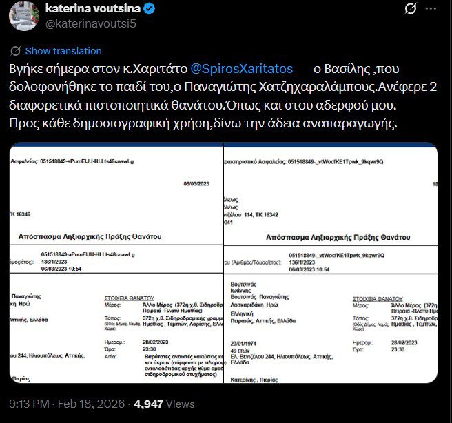 Στη ληξιαρχική πράξη με ημερομηνία εντελώς πρόσφατη 18 Φεβρουαρίου 2026, δεν αναγράφεται καμία αιτία θανάτου.