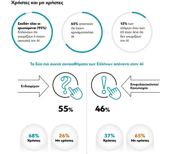 Για παράδειγμα, τα δύο συναισθήματα απέναντι στην ΑΙ που είναι πιο πιθανό να αναφερθούν είναι, κατά σειρά, το «Ενδιαφέρον» (55%) και η «Επιφυλακτικότητα/Καχυποψία» (46%). Όμως, οι δύο ομάδες είναι και άλλοι κόσμοι: Στους μεν χρήστες κυριαρχεί το «Ενδιαφέρον» (68%, +42 μονάδες σε σχέση με τους μη χρήστες), ενώ στους μη χρήστες η «Επιφυλακτικότητα» (65%, +29 μονάδες σε σχέση με τους χρήστες).